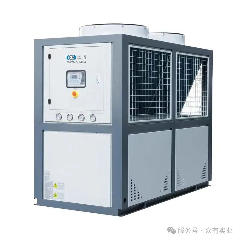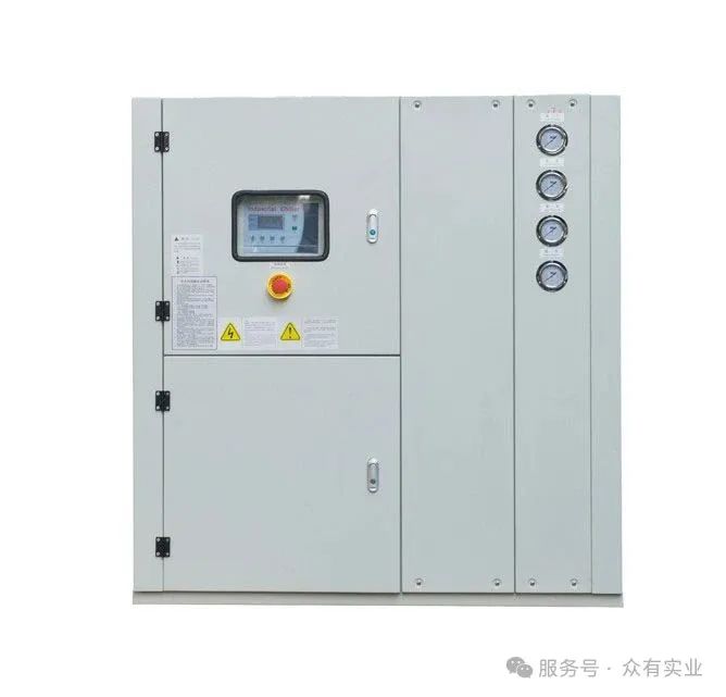 工業(yè)冷水機(jī)分為水冷式工業(yè)冷水機(jī)和風(fēng)冷式工業(yè)冷水機(jī),他們兩者的區(qū)別主要在于冷凝器的不同。水冷冷水機(jī)的冷凝器主要通過循環(huán)冷卻水來帶走熱量,因此水冷冷水機(jī)的冷凝器也通常稱為水炮。與水冷式不同,風(fēng)冷式工業(yè)冷水機(jī)采用風(fēng)扇做為散熱。通常采用翅片式的冷凝器,翅片其實(shí)是指鋁片,即將需要換熱的部位采用外部安裝鋁片,以達(dá)到高效散熱,再通過強(qiáng)力風(fēng)扇將熱氣抽出。
