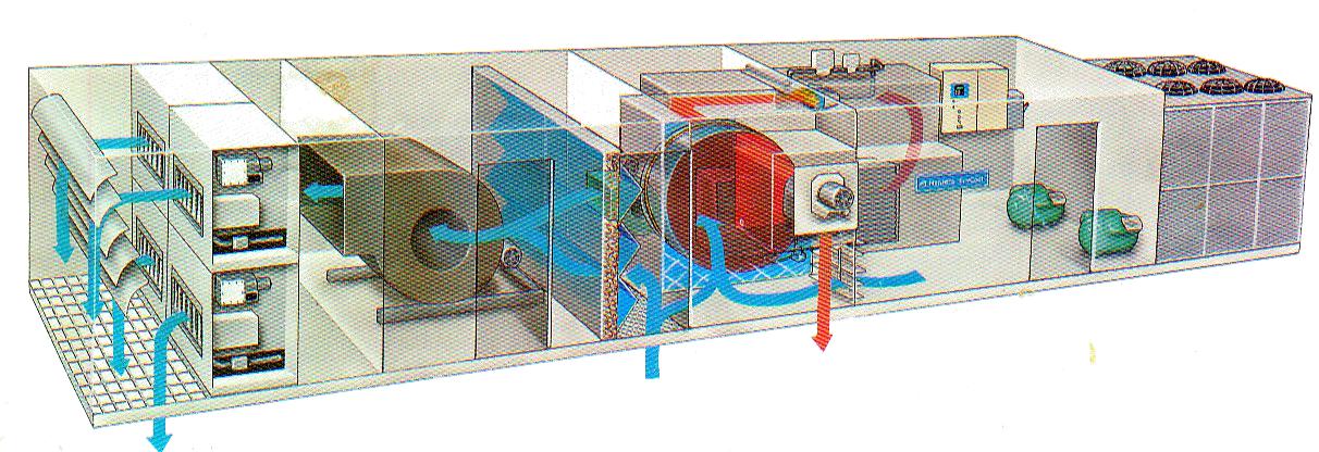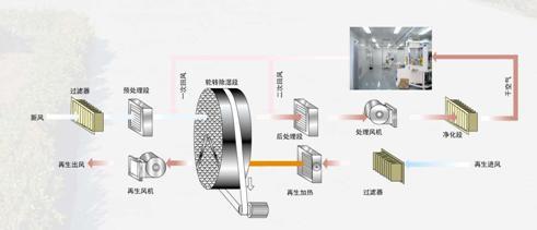 轉(zhuǎn)輪除濕機(jī)的工作流程可分幾個部分完成:預(yù)冷 / 預(yù)熱( 供選件 ) — 轉(zhuǎn)輪除濕 —后冷 / 后熱( 供選件 )