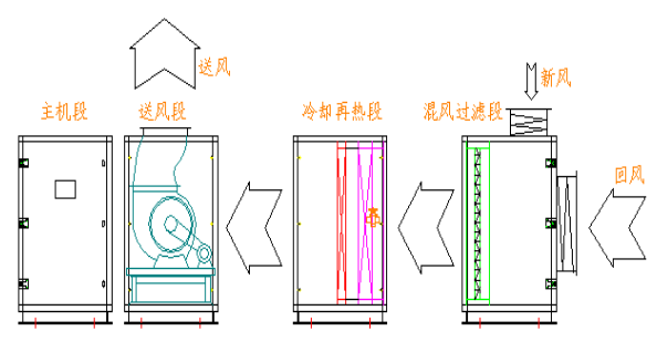 地下工程用除濕空調(diào)機采用模塊化設(shè)計理念和組合式結(jié)構(gòu),由混風過濾段、冷卻再熱段、送風段和主機段組合而成。自由拼裝,連接簡單,拆卸方便。
