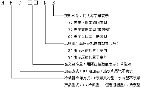 型號(hào)舉例:HF19N 表示名義制冷量為19kW的壓縮機(jī)置于室內(nèi)的風(fēng)冷型單元式空調(diào)機(jī)組。