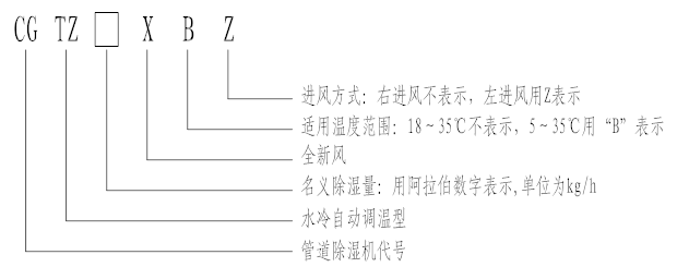 4. CGTZ150XBZ:表示名義除濕量為150kg/h,進風(fēng)方式為左進風(fēng),適用溫度范圍為5℃~35℃的全新風(fēng)水冷自動調(diào)溫型管道除濕機